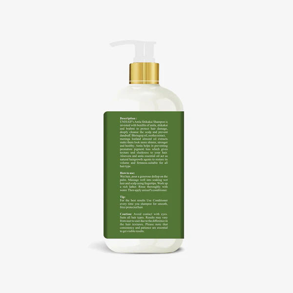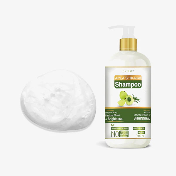 UNISAIF's Amla Shikakai Shampoo is invested with benefits of amla, shikakai and brahmi to protect hair damage, deeply cleanse the scalp and prevent dandruff. Bhringraj oil, reetha extract, moringa leaf and almond oil extracts make them look more shinier, stronger and healthy. Amla helps in preventing premature pigment loss which gives texture and sleekness to your hair. Aloevera and amla essential oil act as natural hair growth agents to restore its volume and firmness. suitable for all hair type.