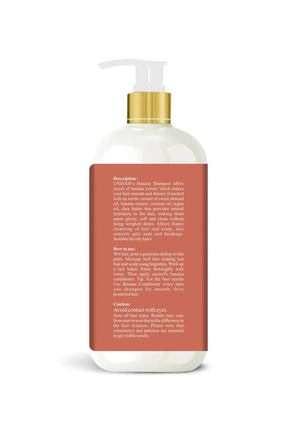 Unisaif's Banana Shampoo offers secret of banana extract which makes your hair smooth and shinier. Enriched with an exotic variant of sweet almond oil, banana extract, coconut oil, argan oil, sheabutter that provides natural hydration to the hair, making them super glossy, soft and clean without being weighed down. Allows foamy cleansing of hair and scalp, also controls split ends and breakage. Suitable for dry hairs.