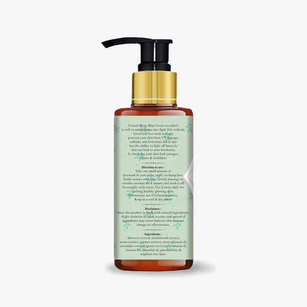 UNISAIF's Misty Mint Face Wash is packed with skin-protecting antioxidants and ingredients like Green tea extract, neem extract, tea tree extract, sweet almond oil and cucumber extract. It protect your skin from UV damage, irritation and redness. Capable off fighting certain bacterial infections that may lead to acne breakouts. It's frequent use makes your skin look younger, manageable, firmer and healthier.