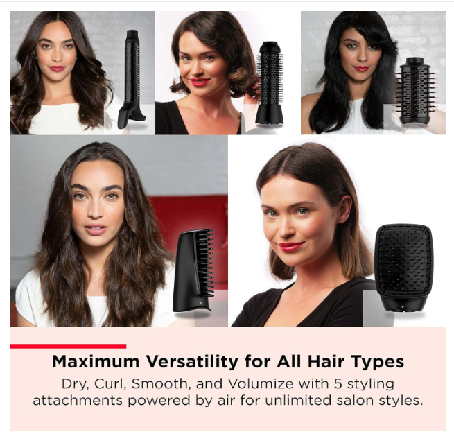 تتضمن خمسة رؤوس: مكواة تجعيد بزاوية 360 درجة، مقاس 32 مم: لتجعيدات شعر لامعة وناعمة بدون تجعد؛ فرشاة بيضاوية حاصلة على براءة اختراع، مقاس 64 مم: لتجفيف شعر كثيف وكثيف؛ مثالية لجميع أنواع الشعر؛ فرشاة مستديرة، مقاس 38 مم: لتكثيف جذور الشعر، وتجعيدات ناعمة، وانحناءات، وتموجات؛ فرشاة مجداف: لمظهر ناعم وأنيق؛ مُركّز تجفيف الجذور: لتقليل وقت التجفيف وتحضير شعرك.