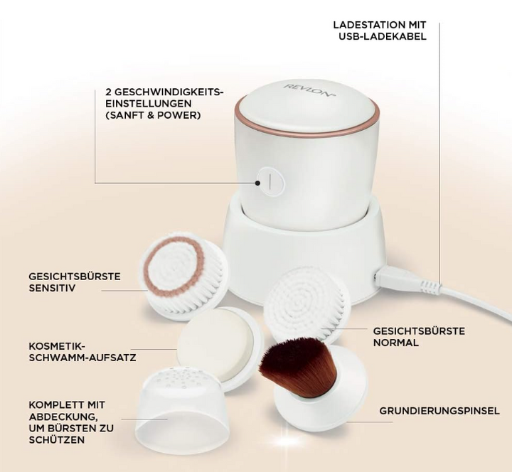 تتضمن المجموعة 4 ملحقات فرشاة: اثنتان للتنظيف العميق للاستخدام على البشرة العادية والحساسة، وإسفنجة تجميل واحدة، وفرشاة أساس واحدة