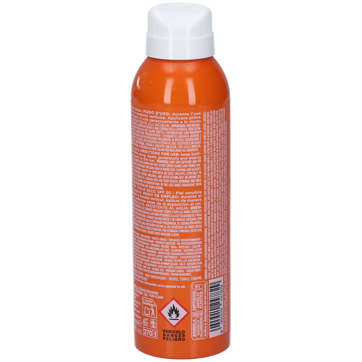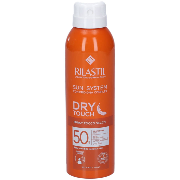 Rilastil Sun System Dry Touch SPF50+ is a high-protection body sunscreen spray, ideal for fair and sensitive skin. Its ultra-light texture absorbs quickly, leaving a dry, transparent finish without feeling greasy. Thanks to its broad-spectrum UVB-UVA filter system and Pro-DNA Complex, it helps prevent sunburn, blemishes, and skin aging, keeping skin healthy and supple. The formula is waterproof, hypoallergenic, non-comedogenic, and dermatologically tested. The 360° spray allows for even application, even in hard-to-reach areas.