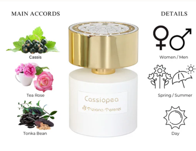سواء كنت ترتدي ملابس أنيقة للخروج ليلاً أو ترغب في رفع مستوى رائحتك اليومية، فإن عطر Tiziana Terenzi Cassiopea Extrait De Parfum يضفي الثقة والسحر والرقي على كل لحظة.