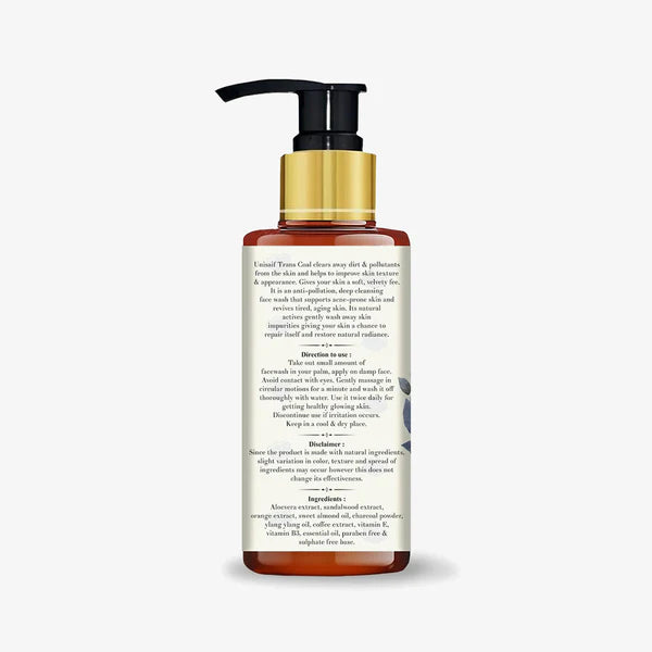 UNISAIF's Trans Coal Face Wash is an anti pollutant, deep cleansing formula that supports extraction of dirt and impurities. Charcoal powder, ylang ylang oil, coffee extract and vitamin e deeply penetrates to remove excess oil, toxins and revitalizes your skin for new cell production. Does not cause any irritation or over drying of skin.