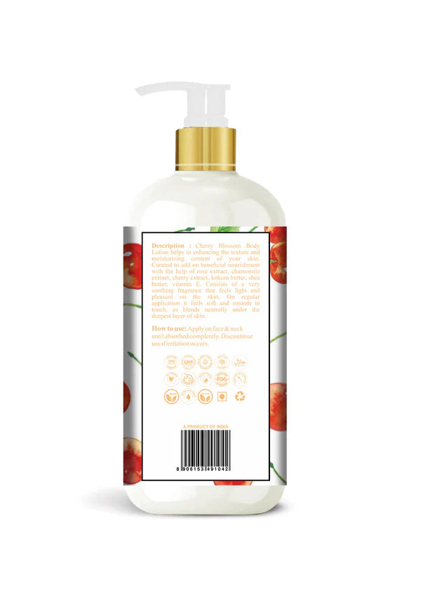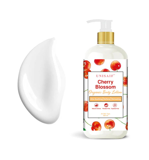 UNISAIF's Cherry Blossom Body Lotion helps in enhancing the texture and moisturizing content of your skin. Curated to add on beneficial nourishment with the help of rose extract, chamomile extract, cherry extract, kokum butter, shea butter, vitamin E. Consists of a very soothing fragrance that feels light and pleasant on the skin. On regular application it feels soft and smooth to touch, as blends neutrally under the deepest layer of skin.