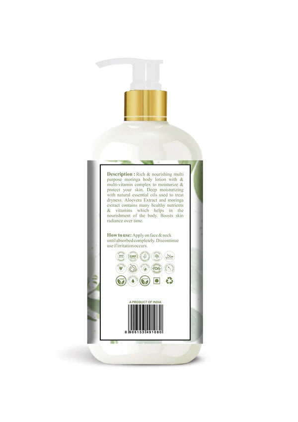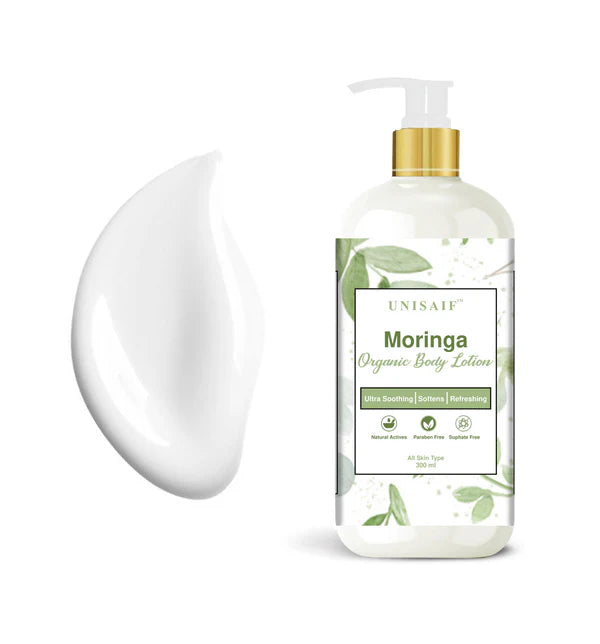 UNISAIF's moringa body lotion infuses your skin with the deepest nourishment of shea butter, vitamin E, licorice and almond oil extracts, giving it an intensive moisturizing dose of plant based goodness. Moringa reduces irritation and inflammation of rhe skin and keeps it super soft and hydrated for long standing hours. Helps in gently polishing your skin, leaving it luminous and incredibly desirable.