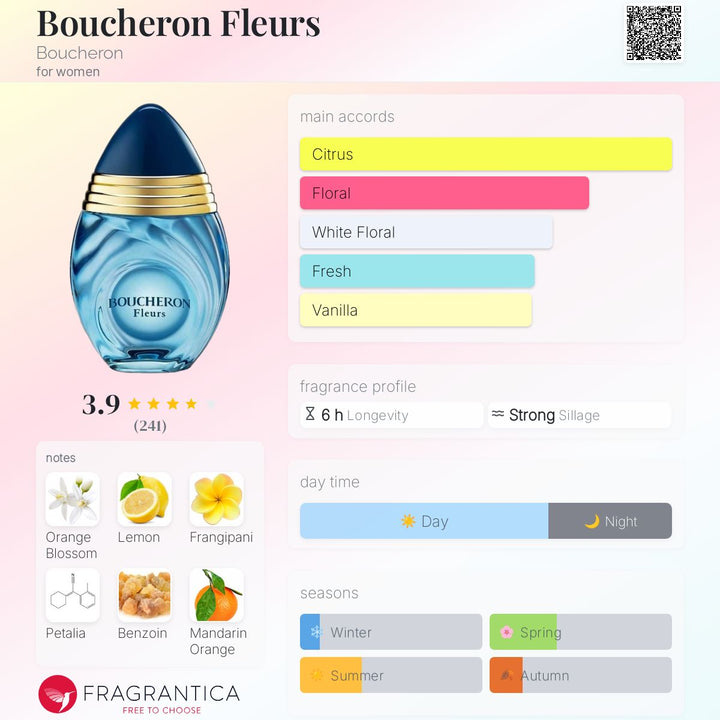 Boucheron Fleurs by Boucheron is a Oriental Floral fragrance for women. Boucheron Fleurs was launched in 2019. Boucheron Fleurs was created by Quentin Bisch and Natalie Gracia-Cetto. Top notes are Lemon, Mandarin Orange and Pear; middle notes are Orange Blossom, Frangipani and Petalia; base notes are Benzoin and Vanilla.