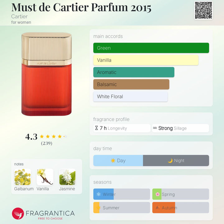 Must de Cartier Parfum 2015 by Cartier is a Oriental Floral fragrance for women. Must de Cartier Parfum 2015 was launched in 2015. Top note is Jasmine; middle note is Galbanum; base note is Vanilla.