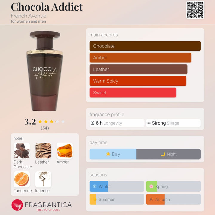 Chocola Addict by French Avenue is a decadent gourmand fragrance launched in 2025. This oriental-inspired composition opens with sweet edible accents of chocolate and citrusy tangerine balanced by warm amber. The heart reveals unexpected contrasts through smoky incense and supple leather accords. Marketed as a unisex scent through Fragrance World, it offers rich sweetness tempered by darker aromatic elements for sophisticated wearability.