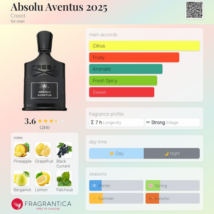 Absolu Aventus 2025 by Creed is a unisex fragrance released in 2025 as part of the Aventus collection. This composition belongs to the citrus, spicy, and woody olfactory families. The fragrance opens with a blend of pineapple, bergamot, black currant, grapefruit, lemon, and pink pepper. The heart features ginger, cardamom, and cinnamon, while the base is composed of patchouli and vetiver.