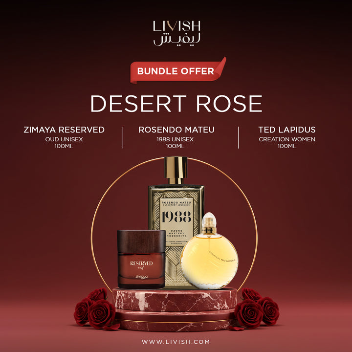 Mysterious and effortlessly captivating, the Desert Rose bundle brings together floral softness and desert-deep intensity. Featuring Rosendo Mateu 1988 EDP (100ml), Ted Lapidus Creation EDT (100ml), and Zimaya Reserved Oud EDP (100ml), this trio blends timeless florals, vintage sophistication, and bold oriental oud notes. A perfect harmony for lovers of contrast — available now at Livish Kuwait.
