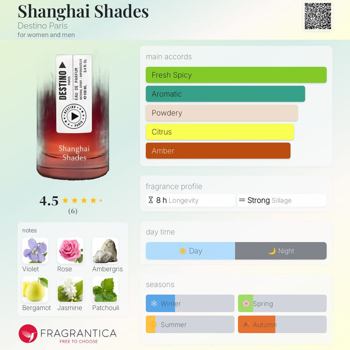 Shanghai Shades is an expression of impertinent seduction, charismatic and captivating.Shanghai Shades encapsulates the matte texture of patchouli enlightened by the dusky brightness of floral & spices. A contemporary elegance subverted by a note of utter impertinence. Dry and smoked ambergris - fluid and shiny incense - sour berries.
