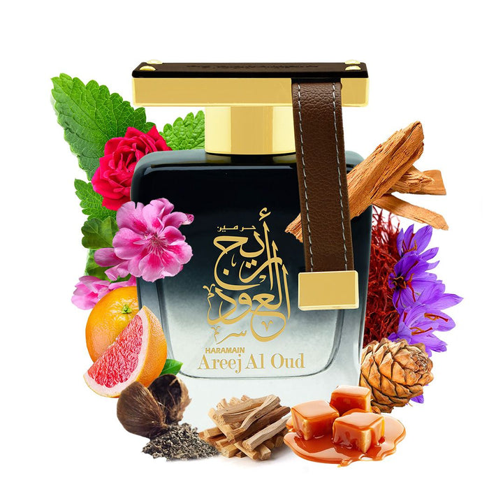The air is thick with anticipation and excitement, as the exquisite Haramain Areej Al Oud Eau De Parfum—a fragrance covered in mystery and temptation. As the sun begins to set and the city's lights come to life, a captivating tale unfolds, drawing you into a world of opulence and intrigue. It all begins with the tantalizing top notes of rose, geranium, and saffron, which dance on the breeze, signalling the start of a sensory adventure. A young woman, adorned in the finest silk, catches a whiff of the enchanting scent, her curiosity provoking. Intrigued by the fragrance's alluring aura, she follows its intoxicating trail, weaving through crowded streets and bustling markets. As she ventures deeper into the heart of the city, the fragrance reveals its secrets, unfolding like a story waiting to be told. The middle notes of cypriol oil or Nagarmotha, patchouli, and Guaiac wood emerge, enveloping her in a rich tapestry of earthy and woody aromas. Each scent tells a tale of ancient forests and distant lands, igniting her imagination and stirring her soul.