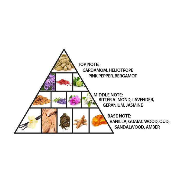 At its core, explosively blended top notes of cardamom, heliotrope, pink pepper, and bergamot seize your attention, leaving an indelible mark of power. As the fragrance unfurls, the heart reveals a complex fusion of bitter almonds, lavender, geranium, and jasmine, infusing the composition with an unyielding depth and boldness. The base notes of vanilla, guaiac wood, agarwood, sandalwood, and amber form an unapologetically robust and commanding foundation, completing this daring aromatic masterpiece.