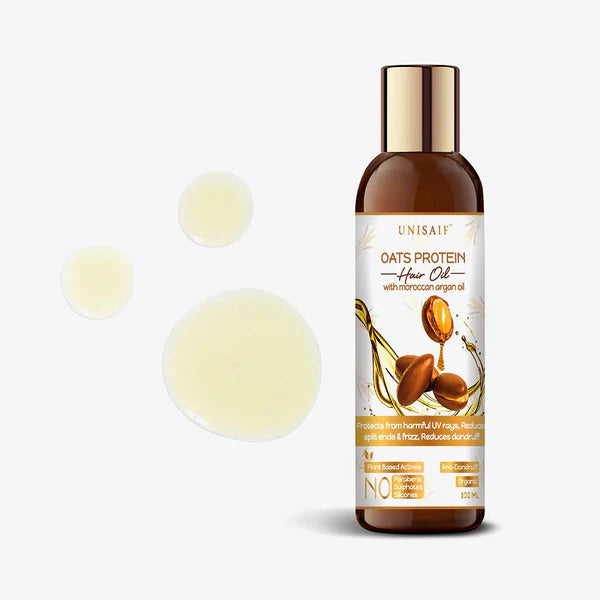 UNISAIF's Oats Protein Hair Oil act as an extra nourishment that improves hair growth and volume. Presence of oats protein extract, milk protein extract, oats essential oil precisely adds natural bounce and silky shine to hairs. Retains elasticity and moisture content of cuticle to avoid frizz. Allows repair of chemically and thermally treated hairs.