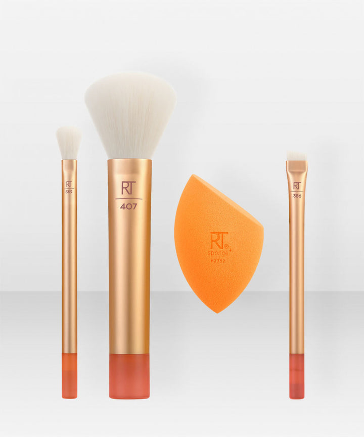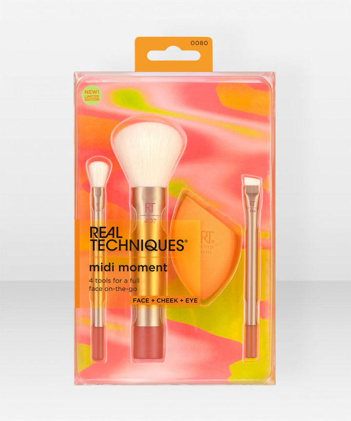 The Real Techniques Orange Crush Midi Moment Brush + Sponge Set includes three brushes and the Miracle Complexion Sponge, making it a perfect travel-friendly kit.