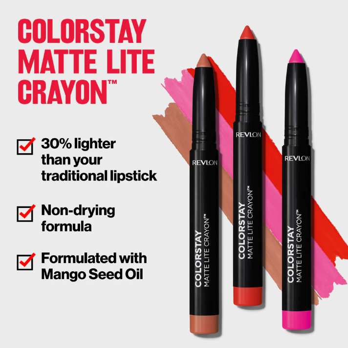 30% lighter than your average lipstick. ColorStay Matte Lite Crayon™ is so lightweight you’ll forget it’s even on. Experience saturated color in a comfortable, non-drying matte formula infused with antioxidant-rich Mango Seed Oil to help replenish lips. In 12 bold yet wearable shades for color play all day.