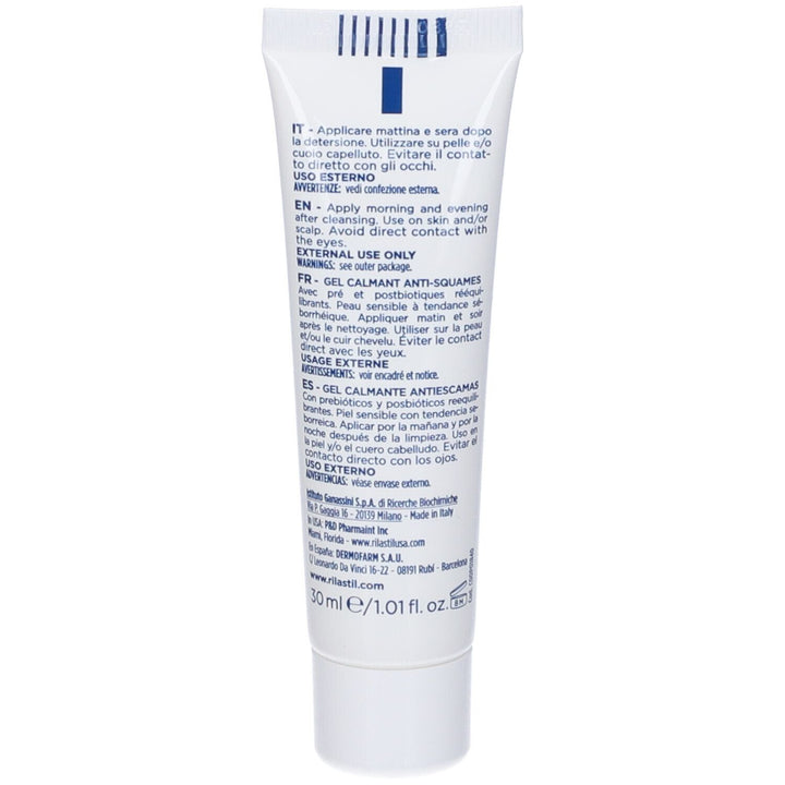 A light, instantly absorbed, anti-scaling gel. Suitable for sensitive, seborrheic-prone skin. It helps reduce excess sebum, flaking, itching, and redness on both the skin and scalp. The Rilastil formula is based on highly innovative PB technology, containing pre- and post-biotics that help maintain the skin's microbiota balance. It leaves skin soft and dry. The ophthalmic applicator allows for localized application on the areas to be treated.