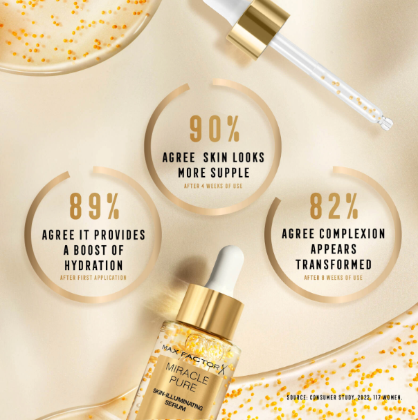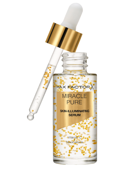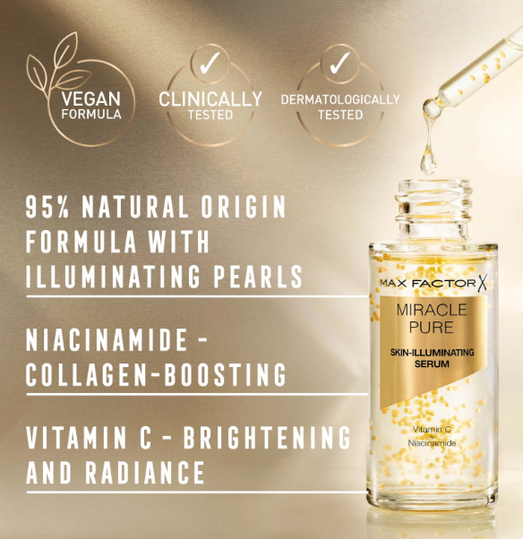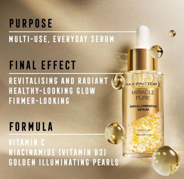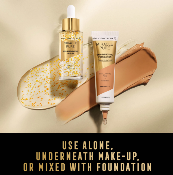 Give your skin a daily boost of vitamins for an immediate healthy-looking glow with Max Factor Miracle Pure Skin-Illuminating Serum. This skin caring and improving serum has golden pearls of illuminating pigments to give skin a revitalised and brighter-looking effect. The clinically proven, vegan formula contains vitamins C and Niacinamide - B3. The multi-use serum can be used alone, under makeup, or mixed with any foundation for a skin caring boost of radiance. Inspired by nature, mastered by Max Factor.