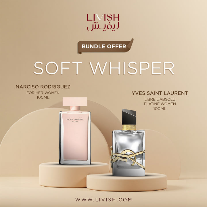 Subtle yet unforgettable – the Soft Whisper bundle blends softness with strength. Featuring Narciso Rodriguez For Her EDT (100ml) and YSL Libre L’Absolu Platine (90ml), this duo offers a harmonious fusion of musky, floral, and bold platinum notes. Ideal for daily elegance or intimate evenings. Available exclusively at Livish Kuwait with special savings.