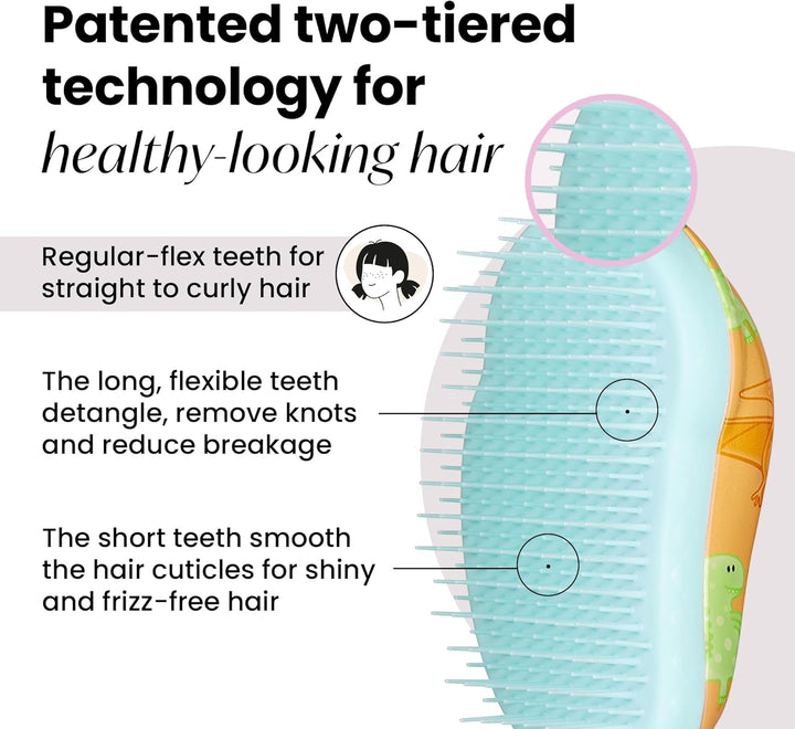 The secret to pain-free detangling lies in the two-tiered teeth. The long teeth flex through tangles and the shorter teeth smooth the hair. It makes healthy, detangled hair – whatever age you are, child’s play!