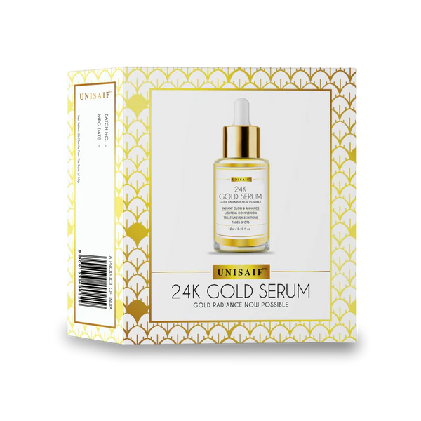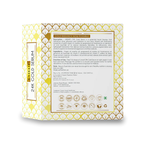 UNISAIF's 24k gold serum is a potential facial therapy that slowly engage shine, glowness and radiance to your face. It is infused with total benefits and illuminating properties of gold and several other essential oils to remove dark spots and blemishes from your skin. Highly moisturizing in nature, to retain skin's flexibility and elasticity. Rosehip, saffron and jojoba oil promotes skin regeneration and boosts blood circulation to reduce collagen destruction. Also facilitates protection against free radicals.