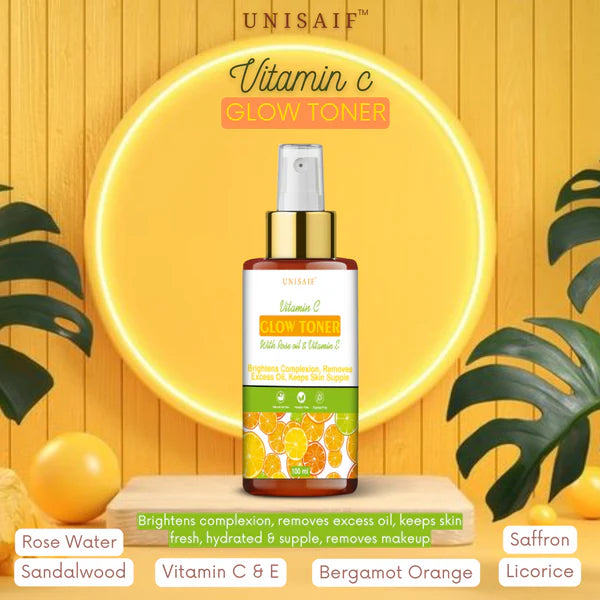 UNISAIF'S viamin C glow toner is filled with natures favourite ingredients that tones and brighten's up your complexion. Presence of vit C, honey and orange peel helps in controlling pigmentation, dark spot reduction and restoring ph of your skin. Its rose essential oil lends moisturizing effects to keep your skin feel fresh all day long. It is safe and healthy for daily use to cure dullness and uneven skin tone. Also helps in boosting collegen production of your face.